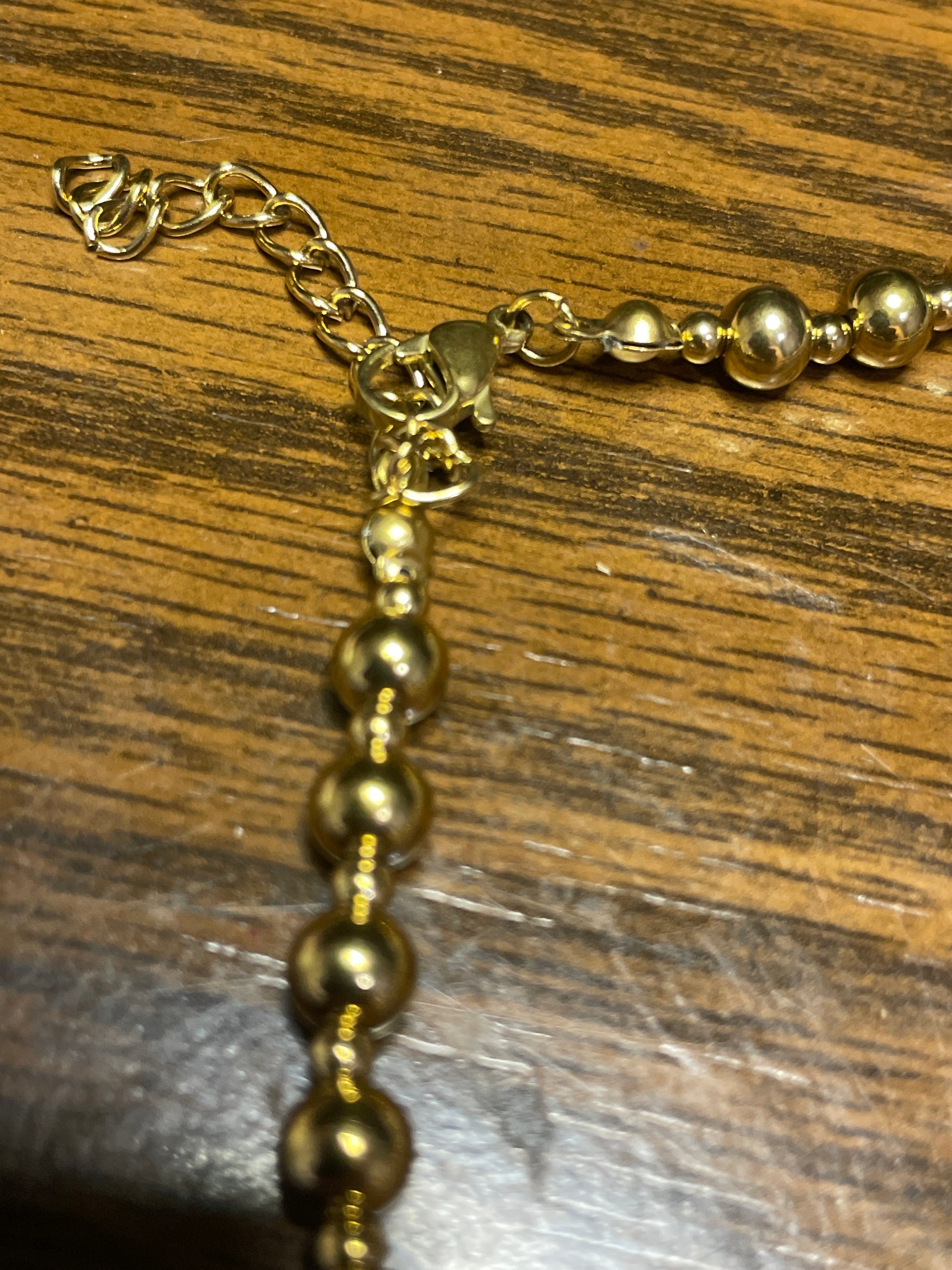 This elegant necklace features graduated round beads in 18K gold plated 304 stainless steel, creating a sophisticated look with a single clasp. The PVD coating process ensures lasting color and durability, while the geometric bead pattern adds dimension and visual interest that works equally well for casual daily wear or dressed-up occasions.