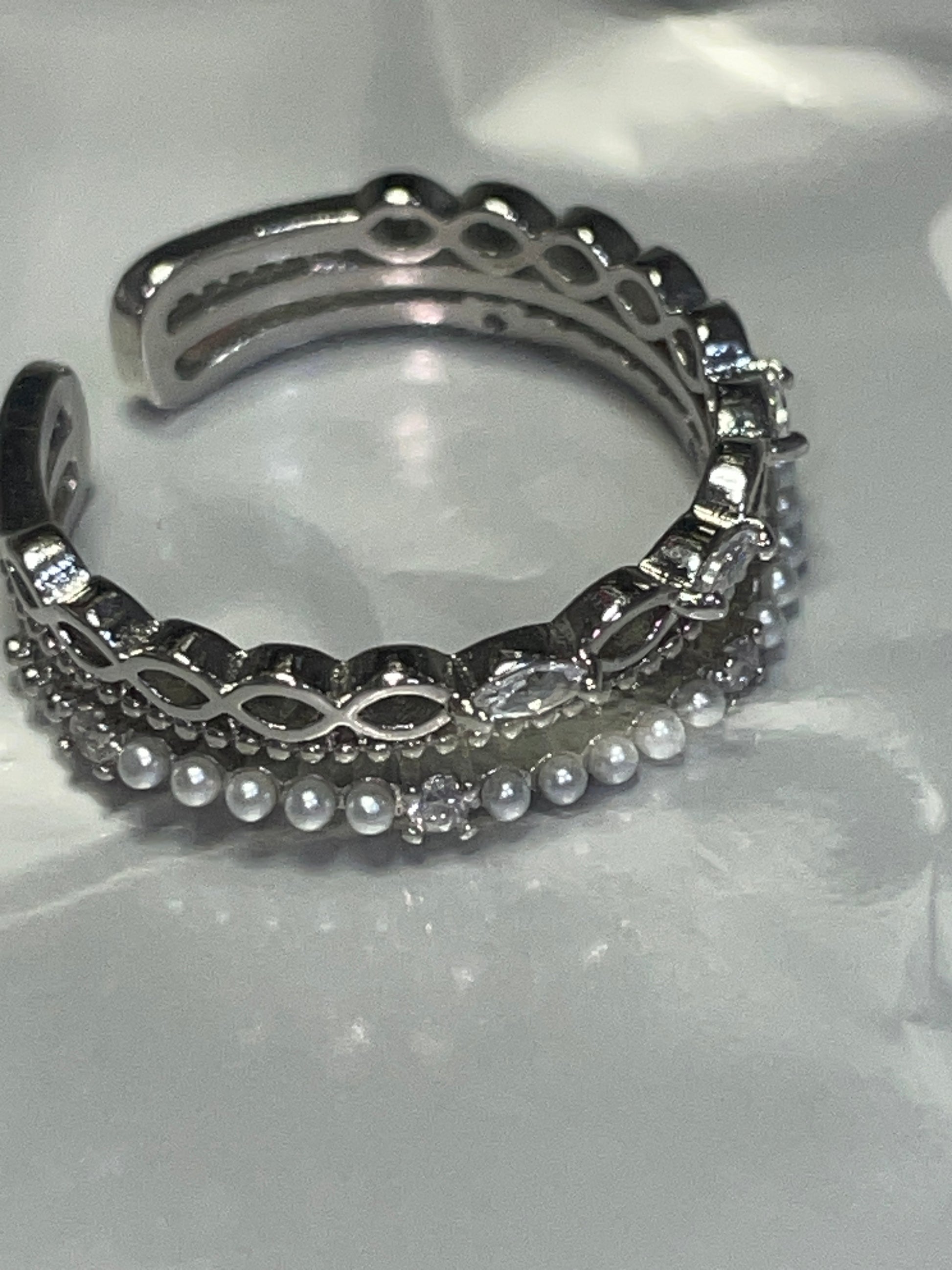 This elegant adjustable ring features a stunning multi-row design, perfect for adding a touch of sophistication to any outfit. The silver-tone band is adorned with a sparkling row of clear cubic zirconia (CZ) stones and a delicate row of lustrous faux pearls, creating a beautiful contrast. The open cuff design allows for easy adjustability, ensuring a comfortable fit for most finger sizes. This versatile fashion jewelry piece is ideal for both everyday wear and special occasions.