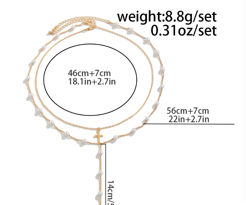 Embrace a touch of modern elegance with this beautiful layered necklace. Featuring delicate silver-tone chains, this necklace showcases a stylish combination of imitation pearls and a subtle cross pendant. The layered design creates a chic and versatile look, with the longer chain forming a flattering Y-shape adorned with spaced pearls. The shorter chain features a dainty cross, adding a meaningful detail. Secured with a lobster trigger clasp closure, this necklace is perfect for adding a touch of understated glamour to your everyday style or as a lovely accent for vacation wear.