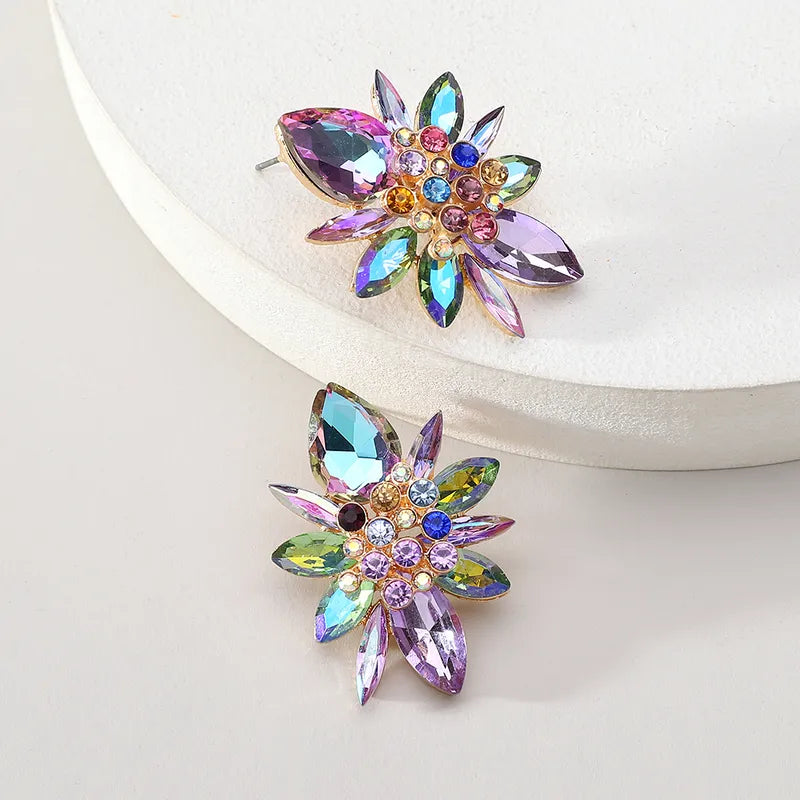 These stud earrings burst with color in a dramatic flower design. Each earring features a ring of marquise-cut rhinestone petals in shades of pink, purple, turquoise, yellow, and iridescent tones that shift in the light. The center is packed with smaller round rhinestones in coordinating colors, creating a kaleidoscope effect that's impossible to ignore.